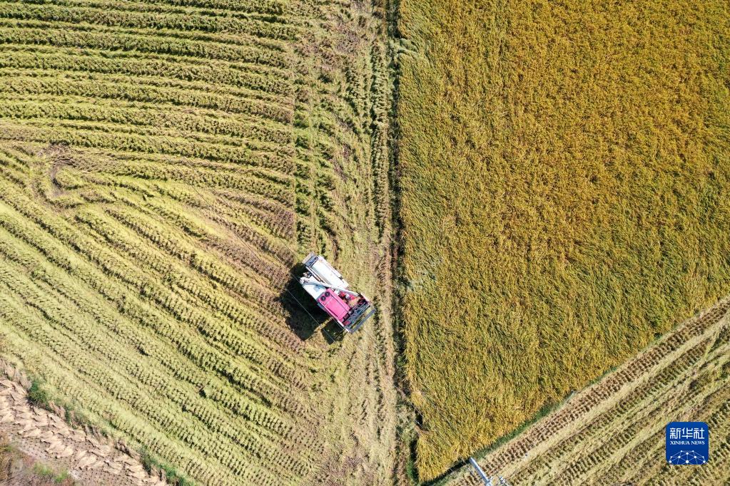 10月20日,在江西省南昌市南昌縣廣福鎮漳溪村,種植戶(hù)在收割晚稻(無(wú)人機拍攝)。