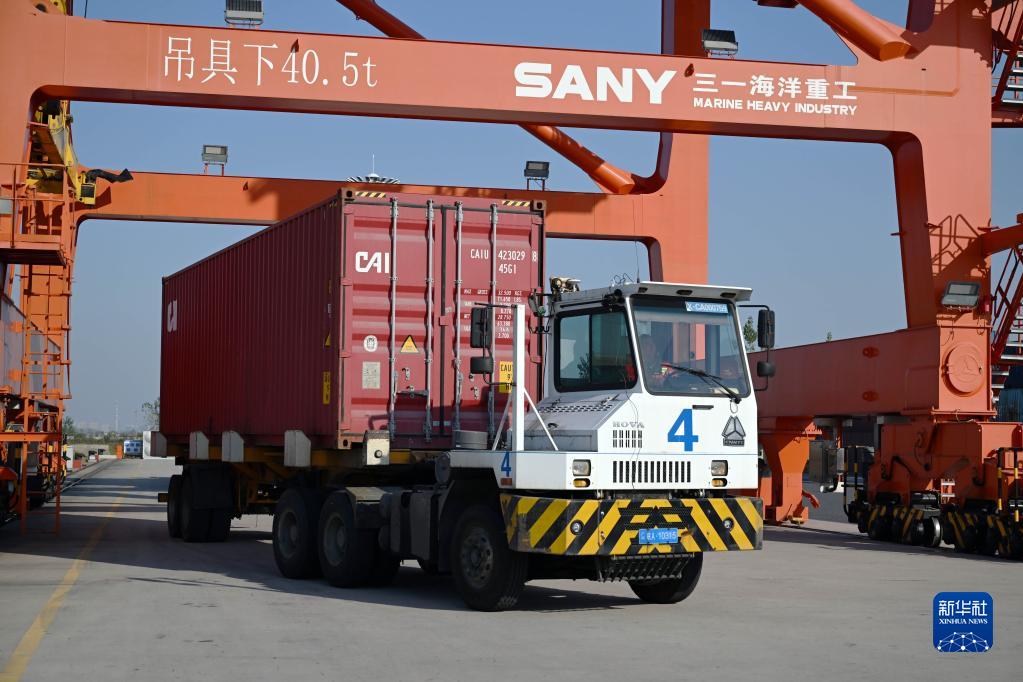 10月19日,貨車(chē)在合肥港國際集裝箱碼頭運輸集裝箱。