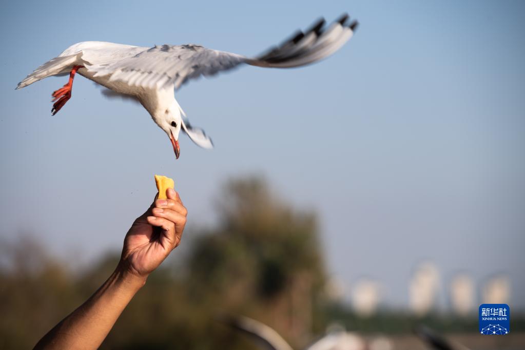 10月20日,市民在滇池畔投喂紅嘴鷗。 新華社記者 王冠森 攝