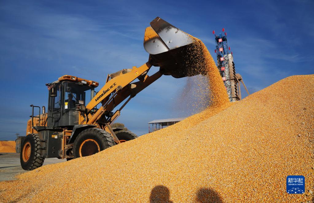 10月20日,在北大荒農墾集團有限公司北安分公司趙光農場(chǎng)有限公司,鏟車(chē)在一處曬場(chǎng)傾倒玉米。