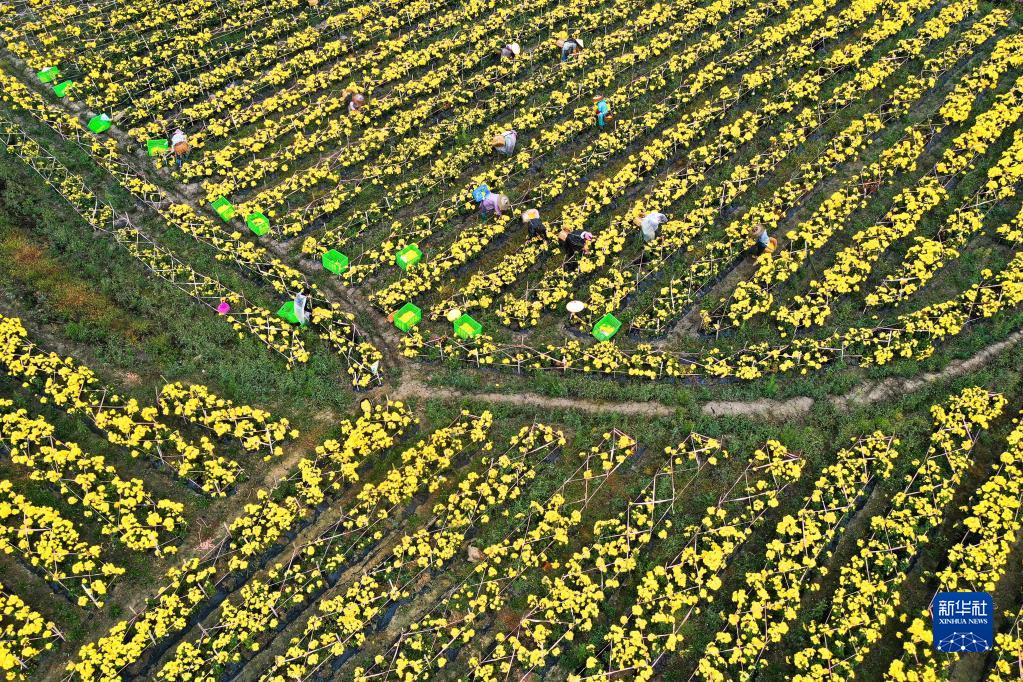 金秋時(shí)節,貴州省黔南布依族苗族自治州貴定縣云霧鎮種植的1000余畝菊花陸續進(jìn)入采摘期,當地村民忙著(zhù)采摘、分揀、烘干菊花,供應市場(chǎng)。