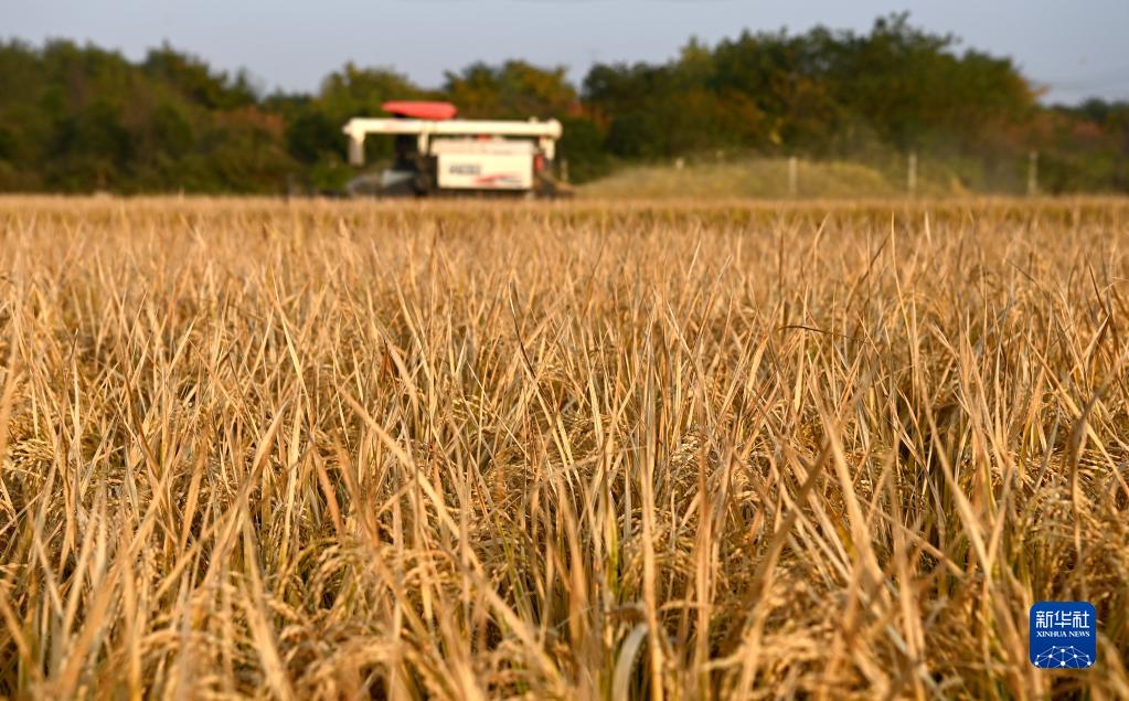 在西安市長(cháng)安區王曲街道皇甫村,收割機在收割水稻(10月21日攝)。
