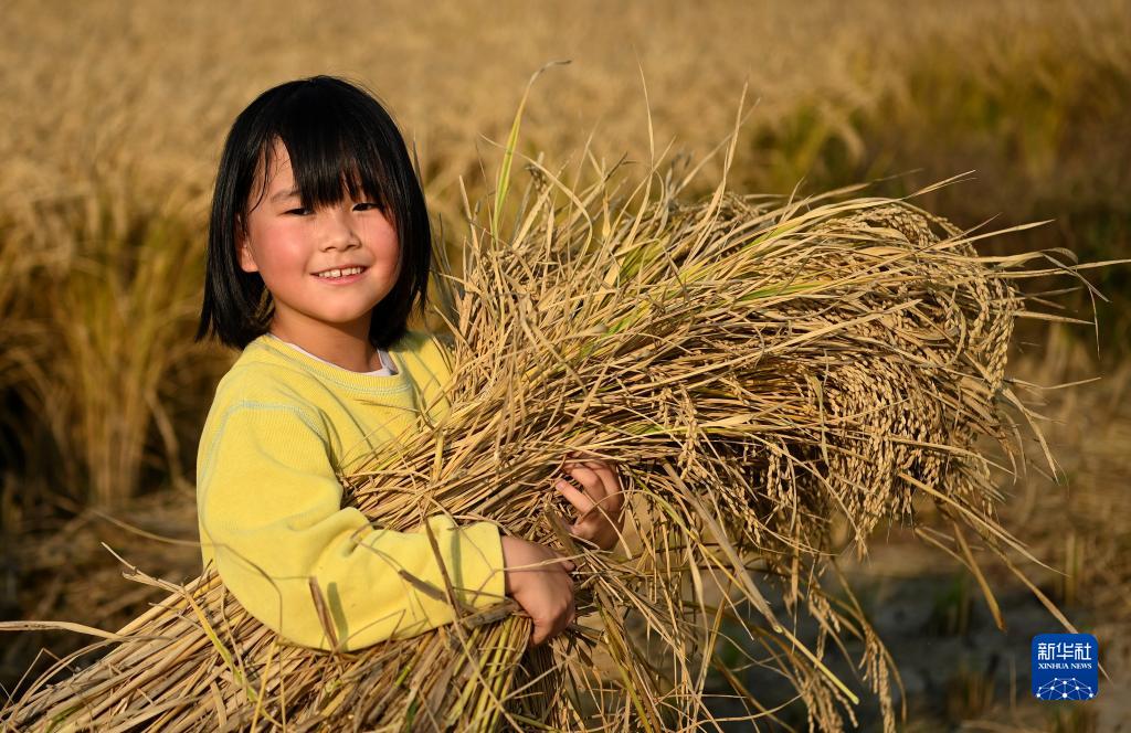 在西安市長(cháng)安區王曲街道皇甫村,一名兒童在稻田里懷抱稻谷(10月21日攝)。