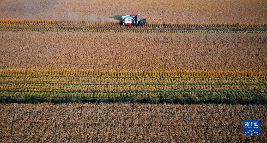 在西安市長(cháng)安區王曲街道皇甫村,收割機在收割水稻(10月21日攝,無(wú)人機照片)。