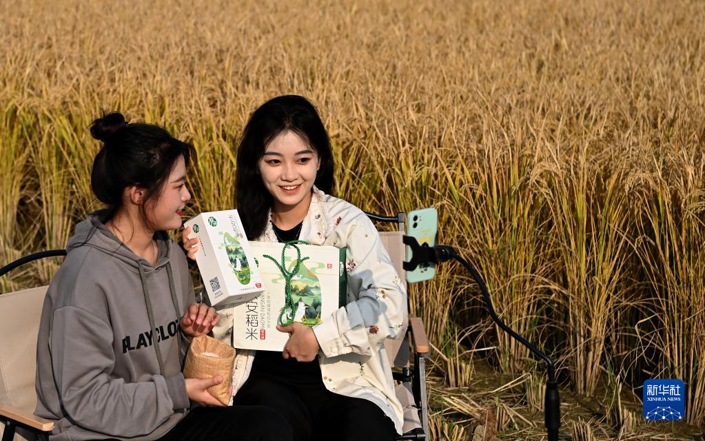 在西安市長(cháng)安區王曲街道皇甫村,兩名主播在稻田邊直播銷(xiāo)售當地的桂花球大米(10月21日攝)。