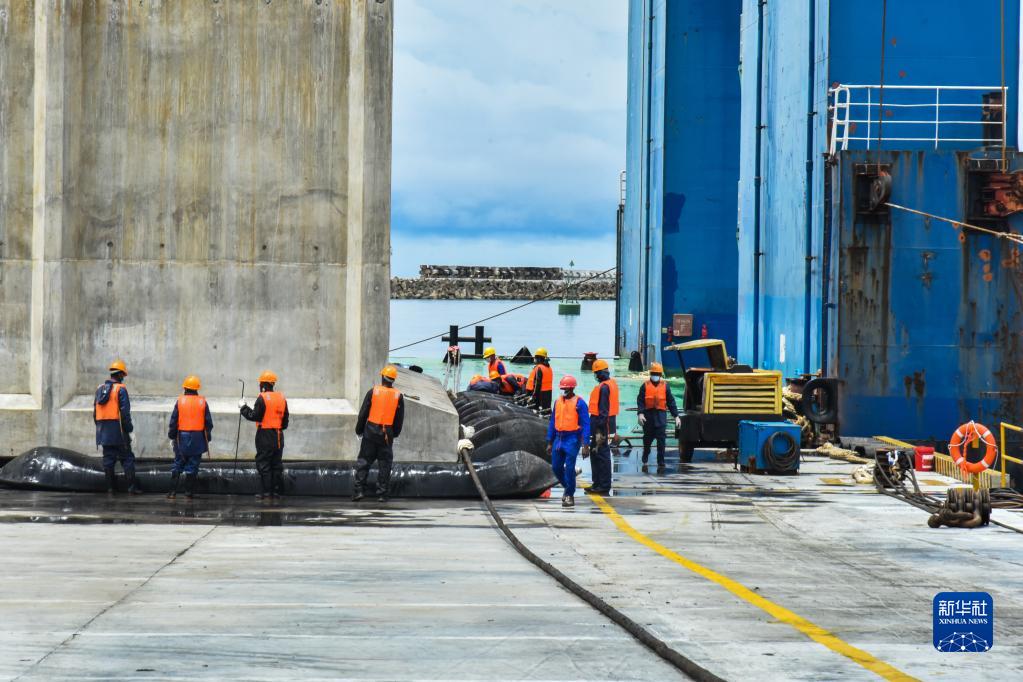 10月22日,工人在喀麥隆克里比進(jìn)行沉箱安裝作業(yè)。