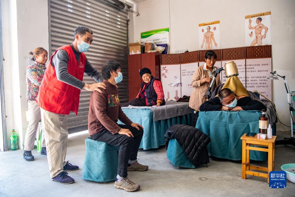 在重慶市綦江區安穩鎮崇河村“自然健康屋”,志愿者為老人提供免費理療服務(wù)(10月18日攝)?!白匀唤】滴荨笔钱數孛裾块T(mén)建立的普惠養老場(chǎng)所。