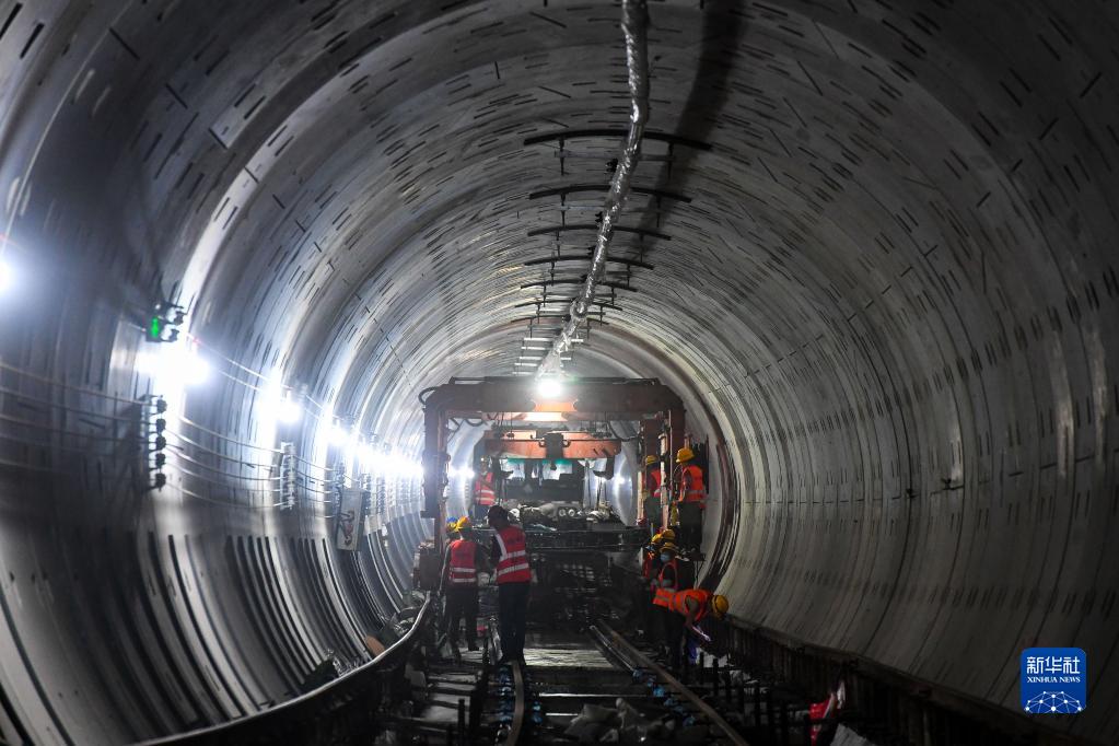 10月26日,施工人員在廣州地鐵11號線(xiàn)隧道內吊裝軌排。