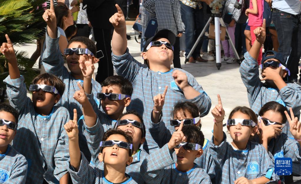 10月25日,突尼斯小學(xué)生戴著(zhù)特制墨鏡在突尼斯市觀(guān)看日偏食。