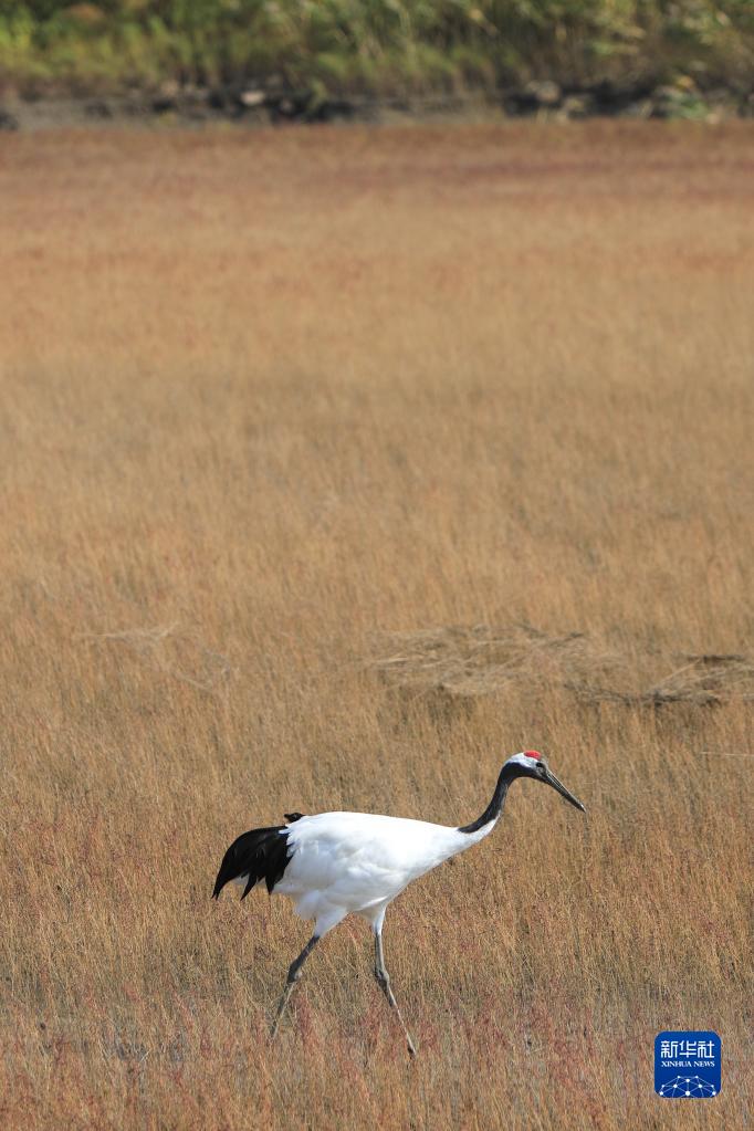 一只丹頂鶴在遼河口國家級自然保護區覓食(2022年9月28日攝)。