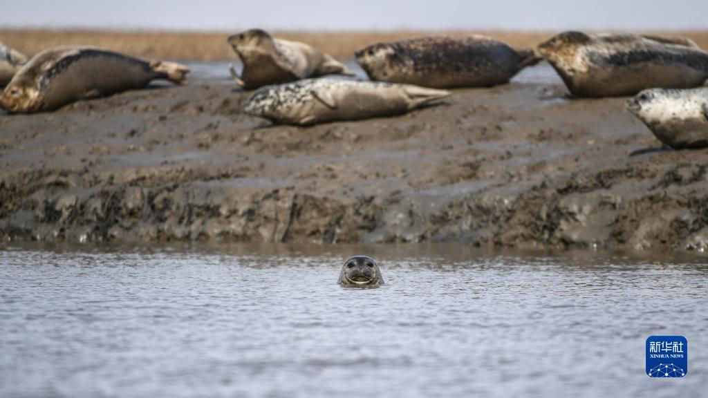在遼寧盤(pán)錦遼河入??谌罍虾S?,一頭斑海豹從水中探出頭(2019年3月28日攝)。