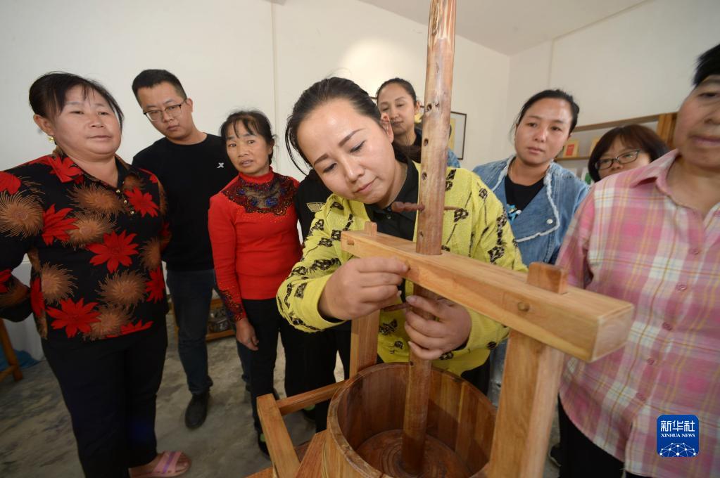 10月19日,在丹寨縣興仁鎮擺泥村,當地種茶能手向村民介紹茶葉的傳統揉捻設備。