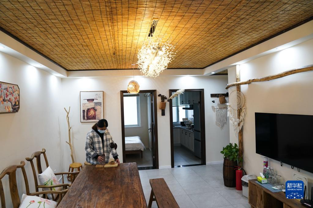 服務(wù)員在江蘇省泗洪縣臨淮鎮勝利社區一家民宿內整理房間(10月26日攝)。