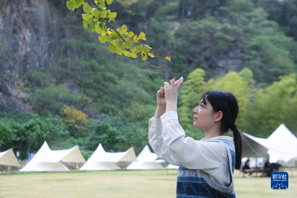 10月26日,游客在位于紅里山村的森林浬礦坑露營(yíng)地里拍照打卡。這個(gè)營(yíng)地是利用廢棄礦坑建造的,能為游客提供露營(yíng)帳篷等休閑娛樂(lè )設施 。