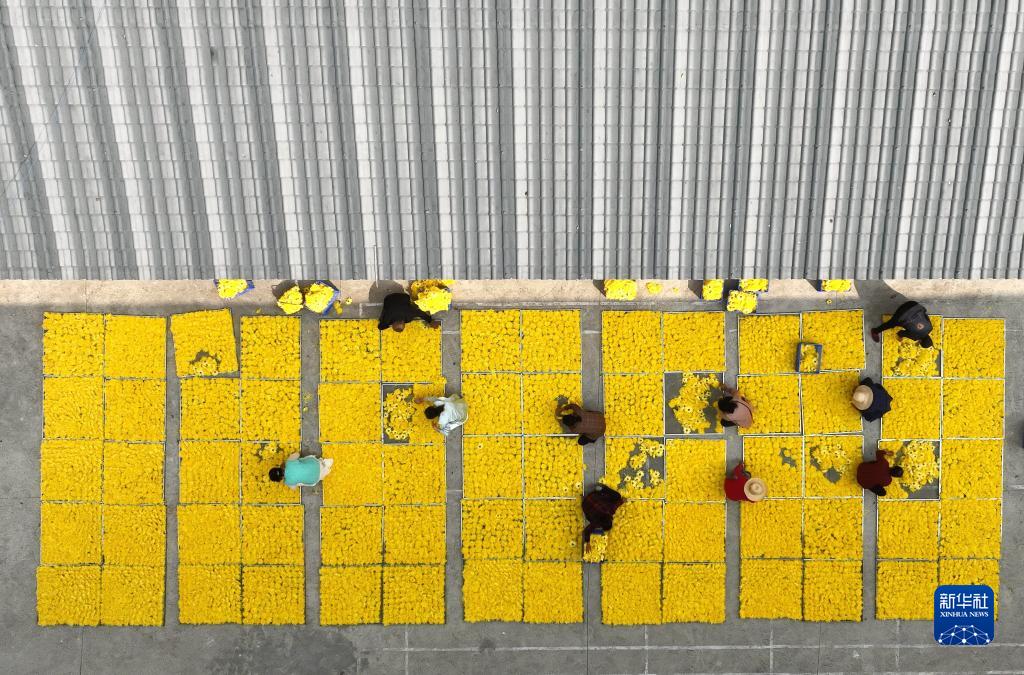 10月26日,岳林村村民整理采摘的菊花(無(wú)人機照片)。