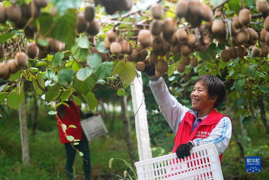 10月27日,在奉新縣赤岸鎮城下村,果農在采摘成熟的獼猴桃。
