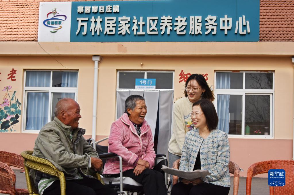 10月26日,在青島萊西市日莊鎮萬(wàn)林居家社區養老服務(wù)中心,工作人員與老人拉家常。