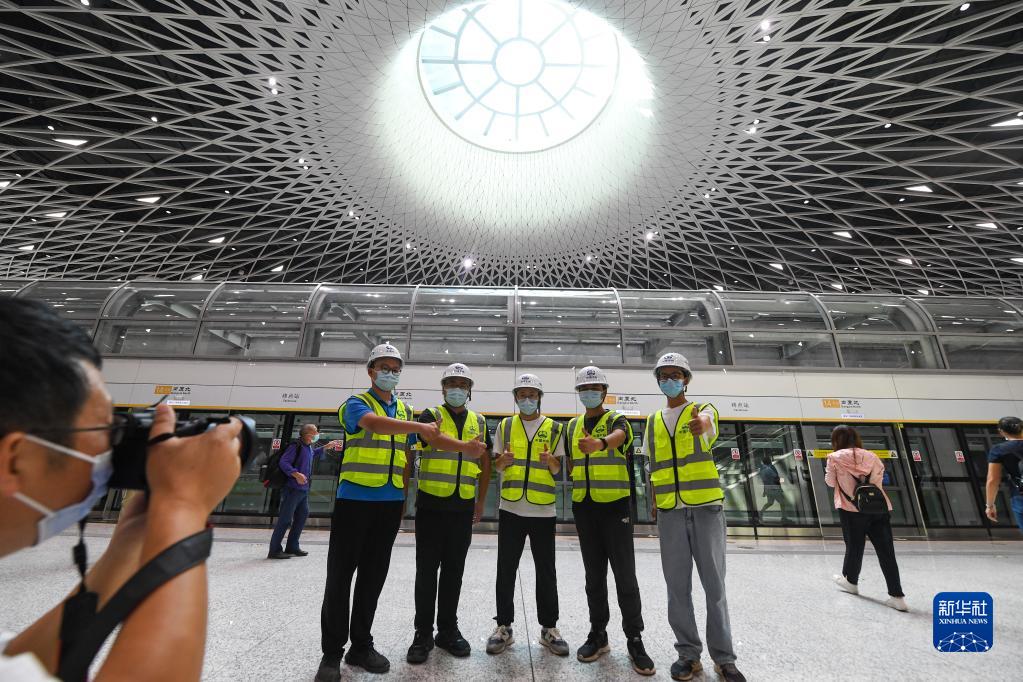 10月28日,參與崗廈北樞紐施工的中國中鐵建設者試乘地鐵14號線(xiàn)前在崗廈北樞紐“深圳之眼”拍照留念。
