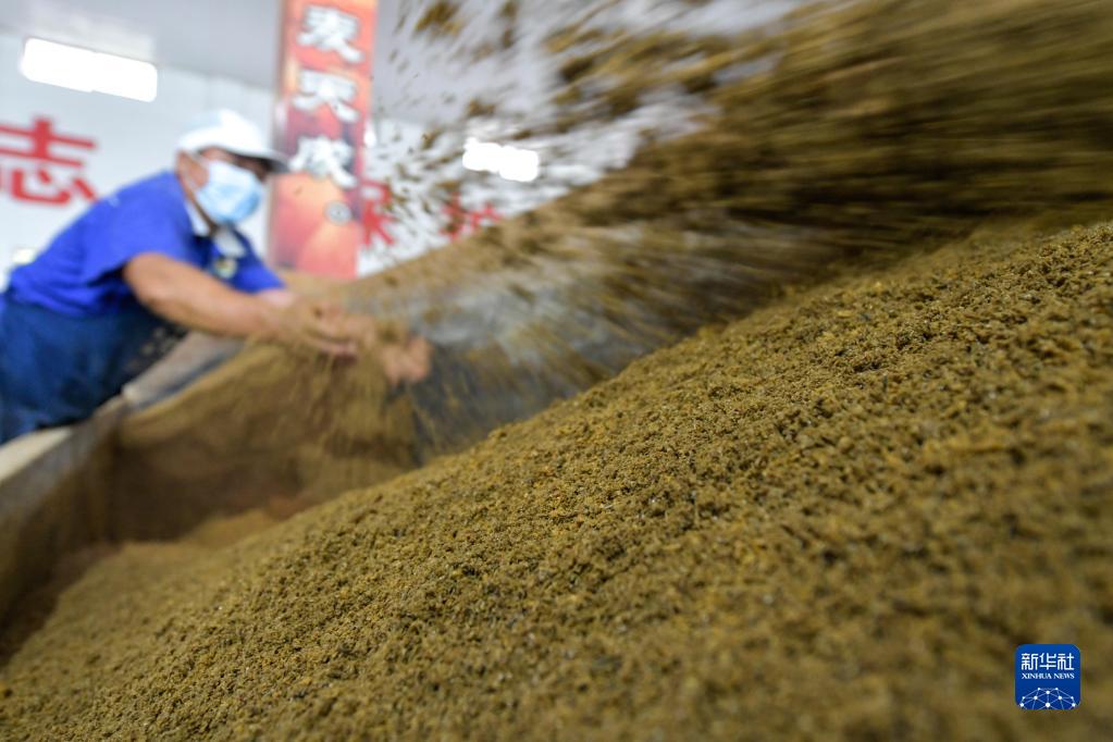 10月28日,在貴州省赤水市黔老翁醋廠(chǎng),工人在手工翻動(dòng)醋坯原料。