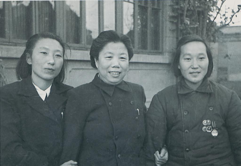 1951年,錢(qián)正英同志(左)和治淮勞模在全國婦聯(lián)招待會(huì )上與鄧穎超同志在一起。