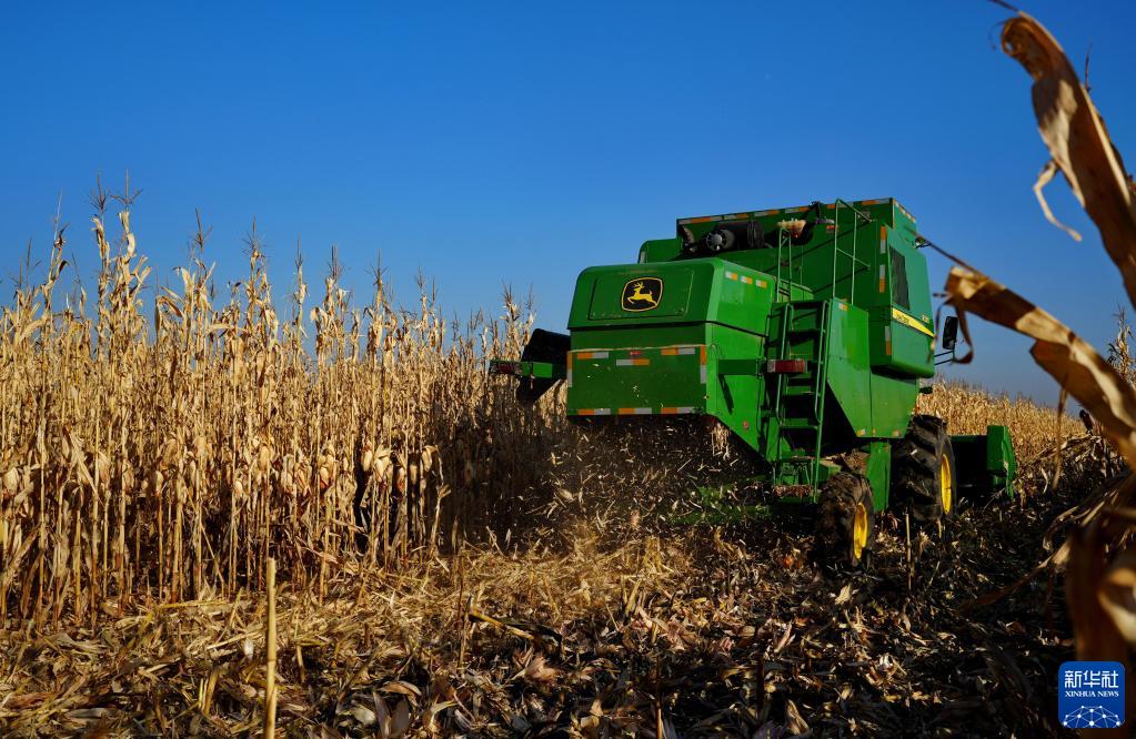 10月28日,在吉林省四平市梨樹(shù)縣國家百萬(wàn)畝綠色食品原料(玉米)標準化生產(chǎn)基地核心示范區,農民駕駛農機進(jìn)行秋收作業(yè)。