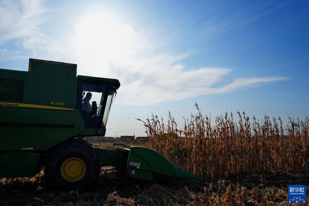 10月28日,在吉林省四平市梨樹(shù)縣國家百萬(wàn)畝綠色食品原料(玉米)標準化生產(chǎn)基地核心示范區,農民駕駛農機進(jìn)行秋收作業(yè)。