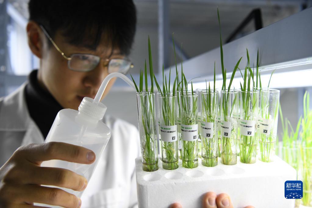 10月27日,在中科院合肥研究院智能所離子束生物工程與綠色農業(yè)研究中心,博士生姜鴻瑞給培育中的水稻加水。