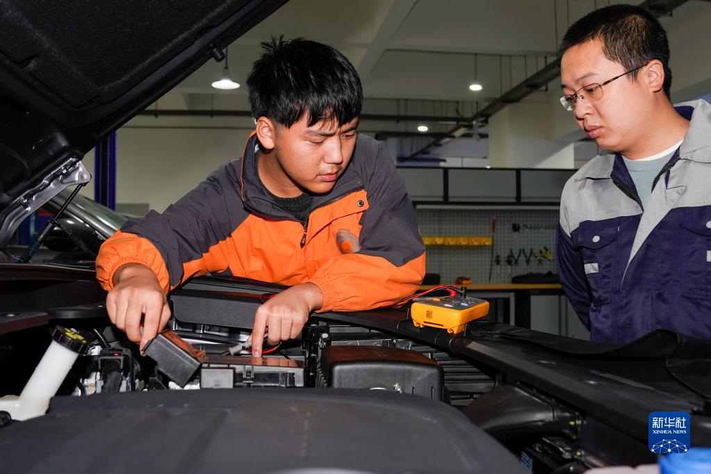 10月27日,重慶市黔江區民族職業(yè)教育中心的學(xué)生在老師(右)的指導下進(jìn)行汽車(chē)故障檢查。