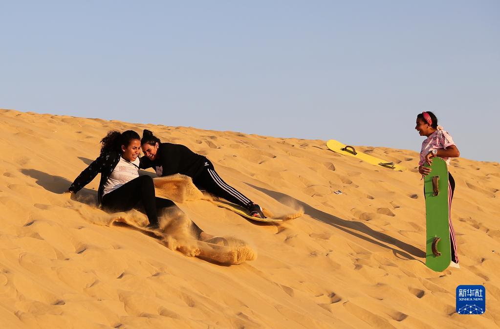 10月29日,游客在埃及法尤姆省的沙漠中玩滑板沖沙。