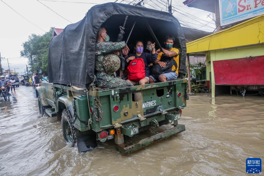 10月30日,人們搭乘軍用車(chē)輛在菲律賓甲米地省涉水前行。