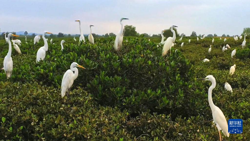 在廣西山口紅樹(shù)林生態(tài)國家級自然保護區,鳥(niǎo)兒在紅樹(shù)林中棲息(8月22日攝,無(wú)人機照片)。