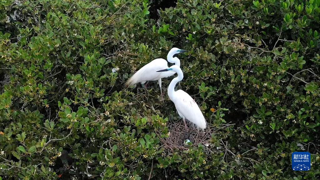 在廣西山口紅樹(shù)林生態(tài)國家級自然保護區,兩只鳥(niǎo)在紅樹(shù)林中棲息(8月25日攝,無(wú)人機照片)。