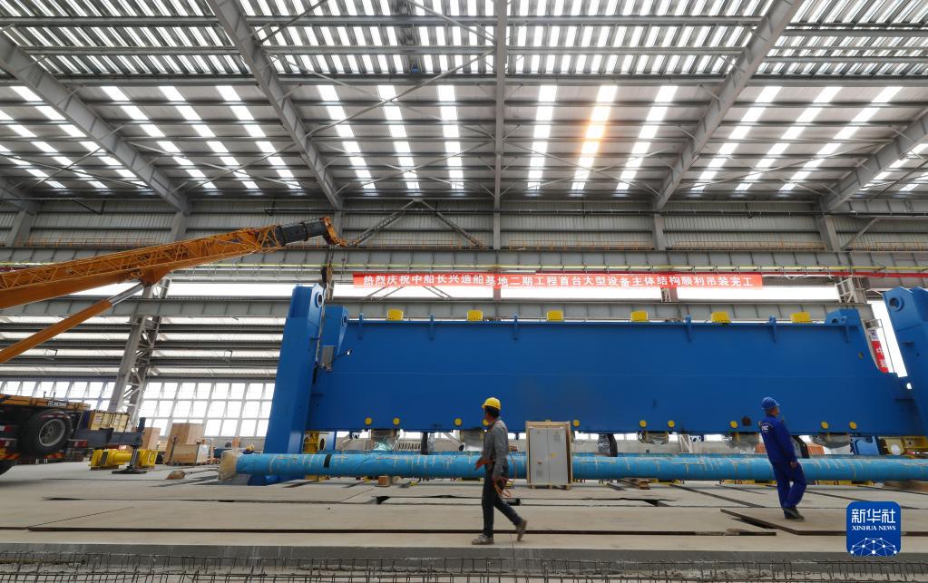 中船長(cháng)興造船基地二期工程船體聯(lián)合車(chē)間內首臺大型設備主體結構吊裝現場(chǎng)(10月31日攝)。