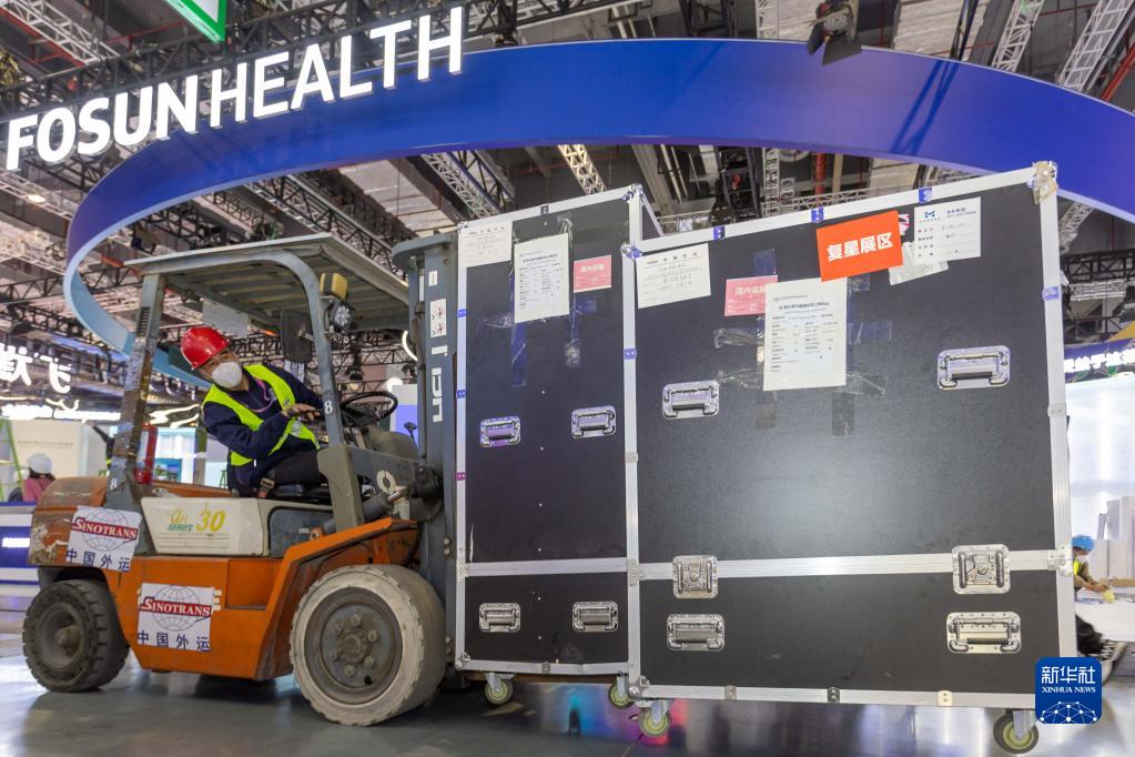 10月31日,工作人員駕駛叉車(chē)運送展品。