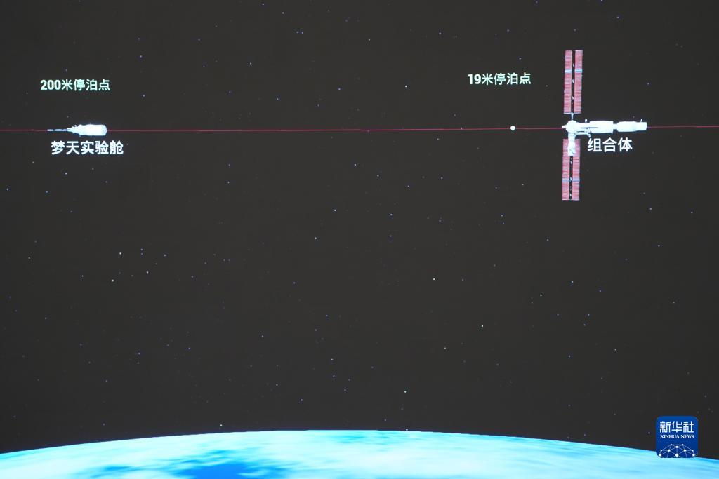 11月1日在北京航天飛行控制中心拍攝的空間站夢(mèng)天實(shí)驗艙與空間站組合體在軌完成交會(huì )對接。這是夢(mèng)天實(shí)驗艙從200米停泊點(diǎn)向19米停泊點(diǎn)靠近的模擬圖像。