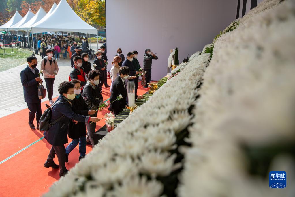 11月1日,民眾走進(jìn)設在韓國首爾廣場(chǎng)首爾圖書(shū)館正門(mén)前的集體焚香所,為遇難者獻花默哀。