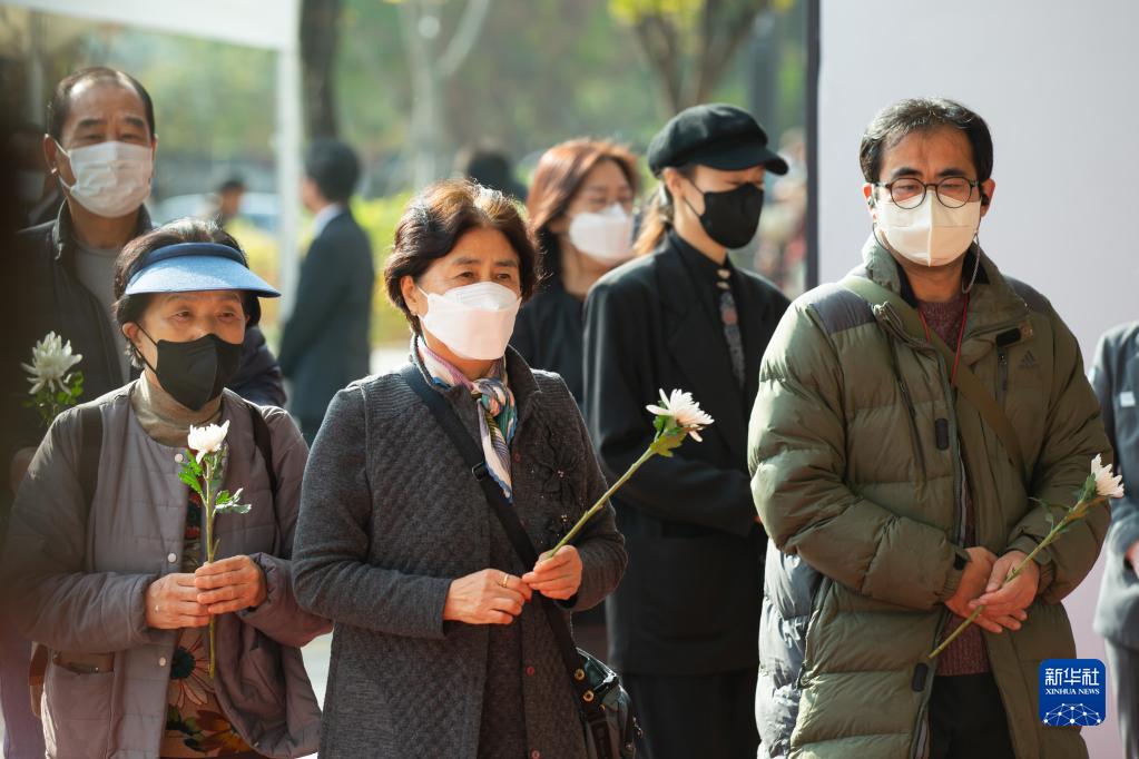11月1日,民眾走進(jìn)設在韓國首爾廣場(chǎng)首爾圖書(shū)館正門(mén)前的集體焚香所,為遇難者獻花默哀。