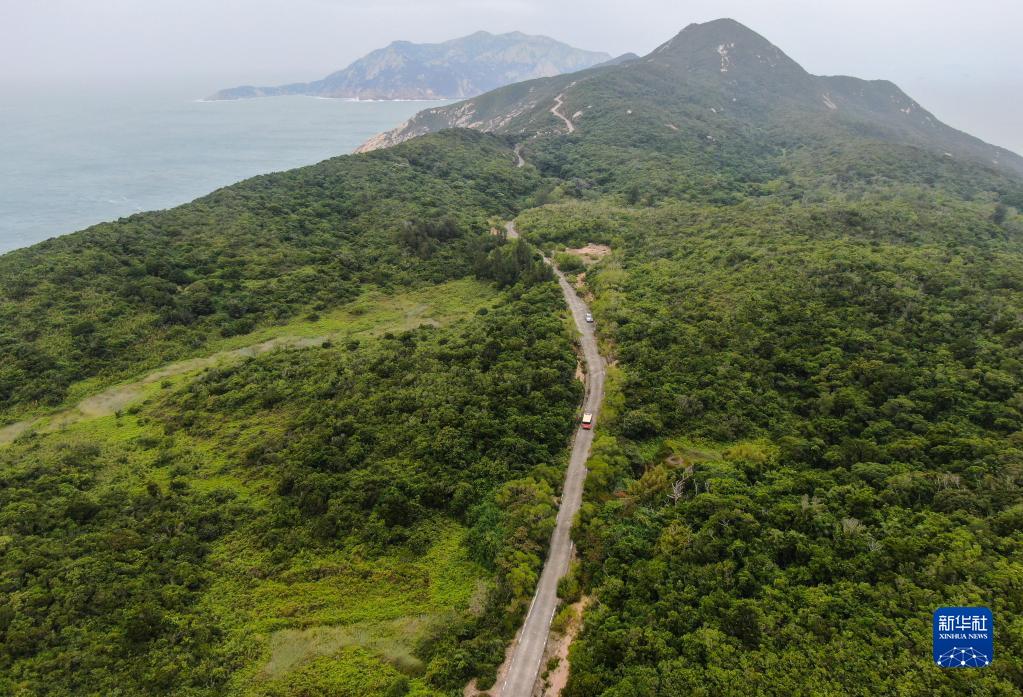 劉清偉和同事駕駛巡邏車(chē)在擔桿島巡山(11月1日攝,無(wú)人機照片)。