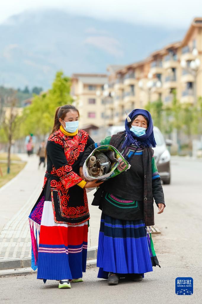 10月27日,在四川省涼山州昭覺(jué)縣南坪社區,易地扶貧搬遷到此的婦女結束了在彝繡工坊的工作后回家。這個(gè)彝繡工坊有100多名繡娘,依照訂單制作彝族傳統服飾制品,繡娘們在此靈活就業(yè),既能為家庭增收,又方便照顧家中老人和孩子,每年可增收數千至上萬(wàn)元。