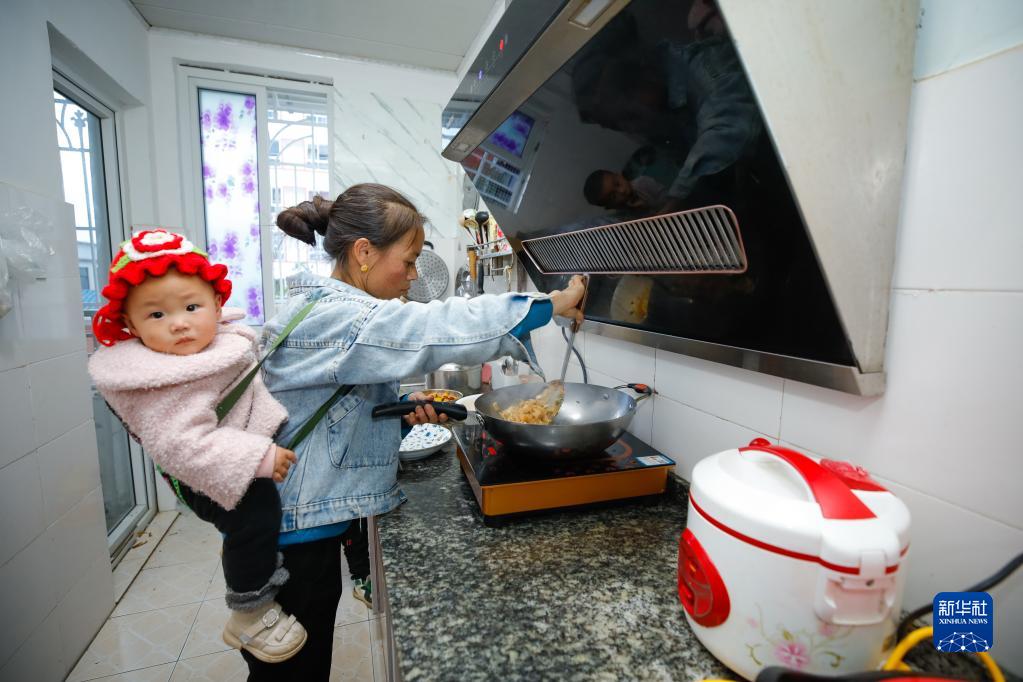 10月28日,在四川省涼山州越西縣越城鎮城北感恩社區,易地扶貧搬遷到此的沙馬石各在配備了現代化炊具的廚房里準備晚餐。搬進(jìn)樓房的沙馬石各再不用在傳統的火塘邊做飯,生活條件有了很大改善。