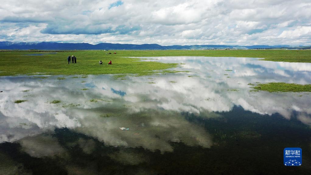 游客在甘肅省甘南藏族自治州瑪曲縣河曲馬場(chǎng)的濕地游覽(2019年6月22日攝,無(wú)人機照片)。