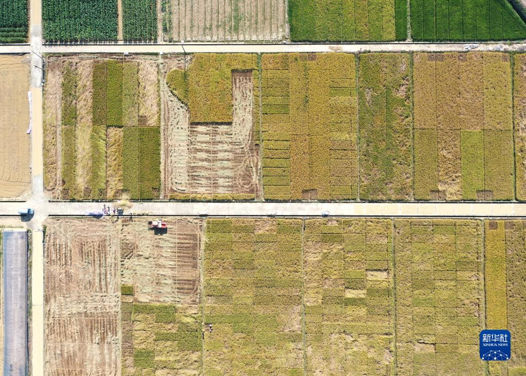 在廣西南寧市興寧區五塘鎮雜交水稻優(yōu)質(zhì)化育種基地,人們在收獲稻種(11月2日攝,無(wú)人機照片)。