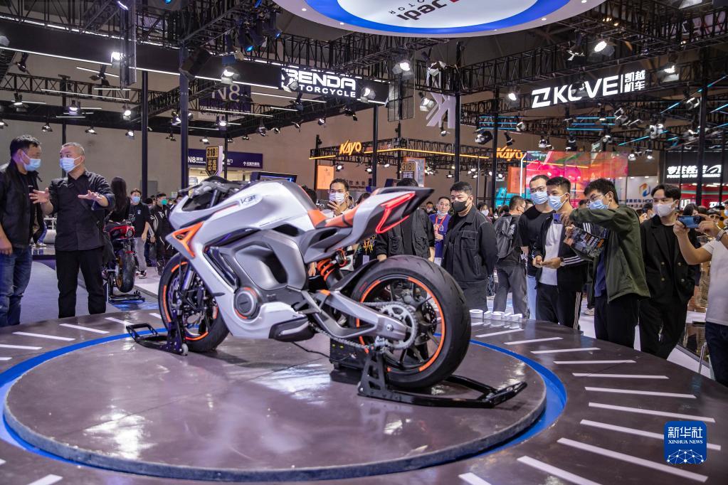 11月2日,在重慶國際博覽中心舉行的第二十屆中國摩博會(huì )現場(chǎng),觀(guān)眾在參觀(guān)純電摩托車(chē)。