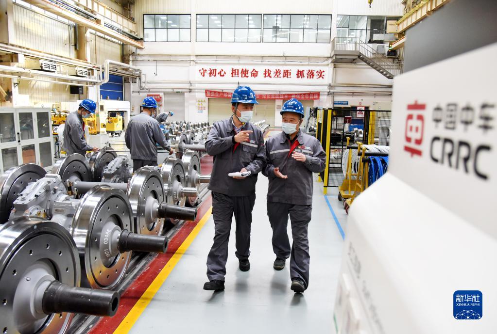 11月2日,在中車(chē)青島四方機車(chē)車(chē)輛股份有限公司轉向架分廠(chǎng)車(chē)間,郭銳(右二)在與工友交流。