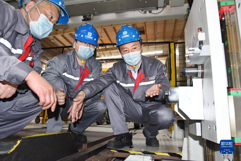11月2日,在中車(chē)青島四方機車(chē)車(chē)輛股份有限公司轉向架分廠(chǎng)車(chē)間,郭銳(右一)與同事對自動(dòng)檢測主動(dòng)找正裝置進(jìn)行驗證。