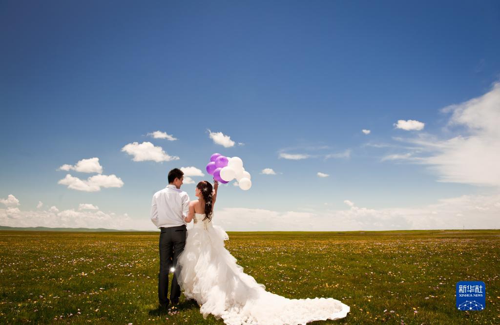 四川若爾蓋濕地國家級自然保護區鮮花盛開(kāi)時(shí)節,一對情侶在拍攝婚紗照(2022年6月24日攝)。