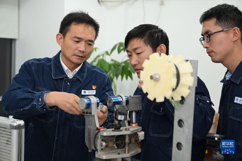 11月2日,在國網(wǎng)安徽省電力有限公司宿州供電公司,廖志斌(左)和同事一起研發(fā)輸電線(xiàn)路運檢工具。