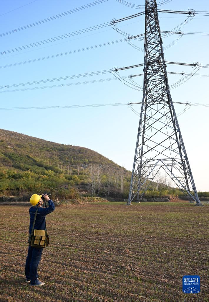 11月2日,在宿州市埇橋區符離鎮,廖志斌用望遠鏡對輸電線(xiàn)路進(jìn)行巡檢。