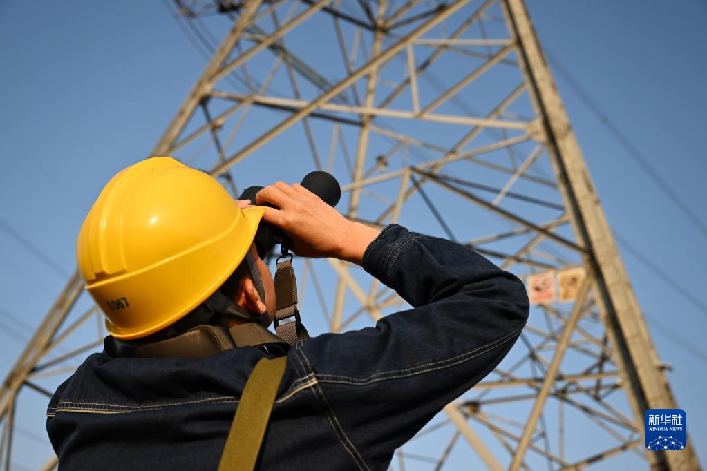 11月2日,在宿州市埇橋區符離鎮,廖志斌用望遠鏡對輸電線(xiàn)路進(jìn)行巡檢。