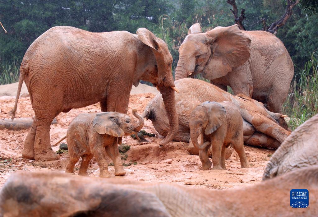 11月3日,兩頭新生非洲象寶寶在媽媽陪伴下玩紅泥。